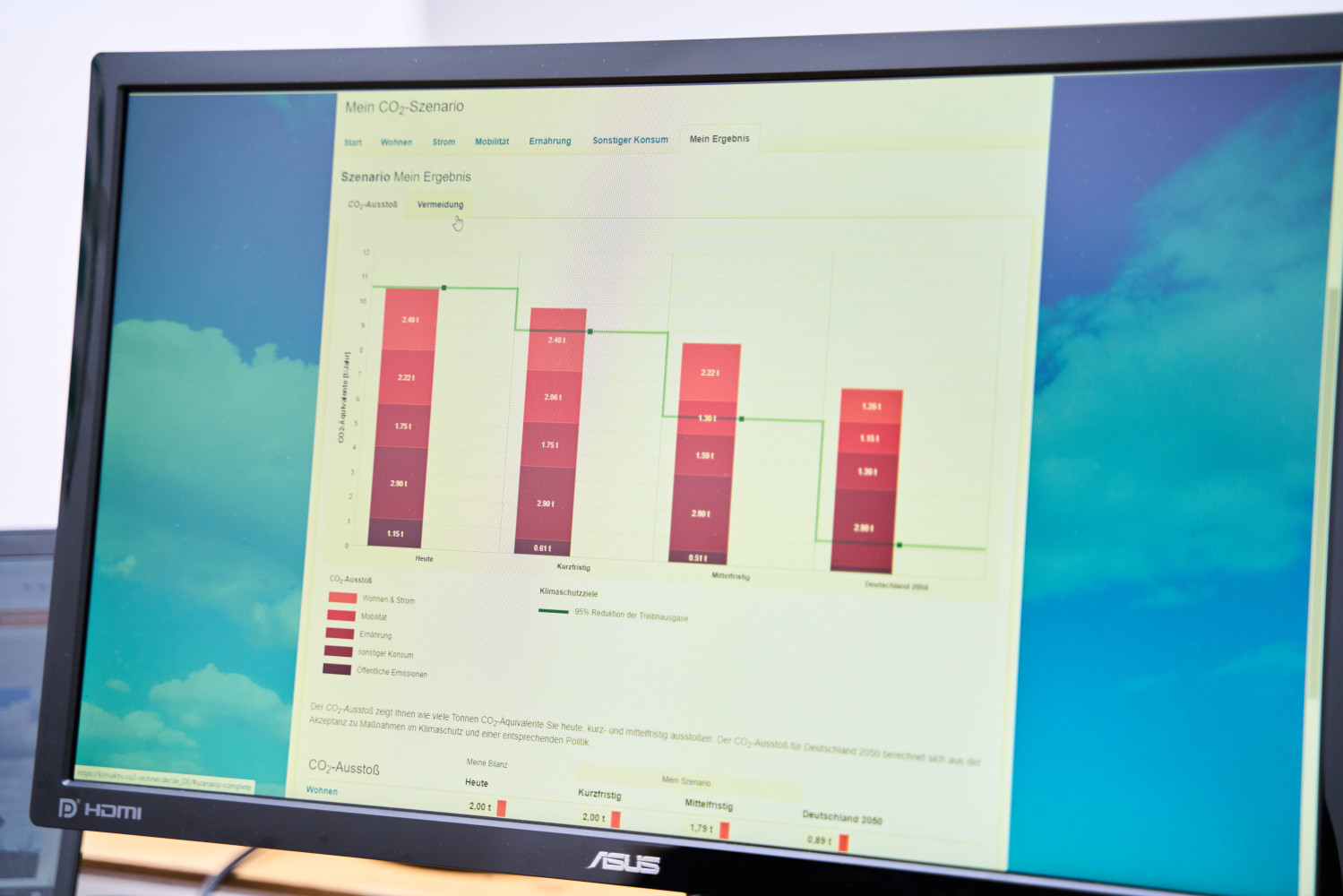 Mit wenigen Klicks kann erprobt werden, welchen Einfluss jede und jeder Einzelne auf die gesamtgesellschaftliche Klimabilanz bis ins Jahr 2050 nehmen kann.