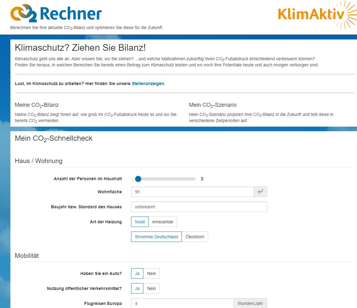 Mit dem CO2-Rechner für Privatpersonen können alle ganz einfach den persönlichen CO2-Fußabdruck ermitteln. In nur 2 Minuten erhalten die Anwenderinnen und Anwender eine Schnellbilanz. Bei der detaillierten CO2-Bilanz schenke ich dem Klimaschutz ca. 10- 15 Minuten. Und wenn ich so richtig in das Thema eintauchen möchte, dann kann ich mit weiteren 10-30 Minuten ein individuelles Klimaschutzszenario erstellen: auf Basis meiner heutigen CO2-Bilanz werden die Projektionen durchgeführt, bis hin zu einem Deutschen Durchschnitt im Jahr 2050.