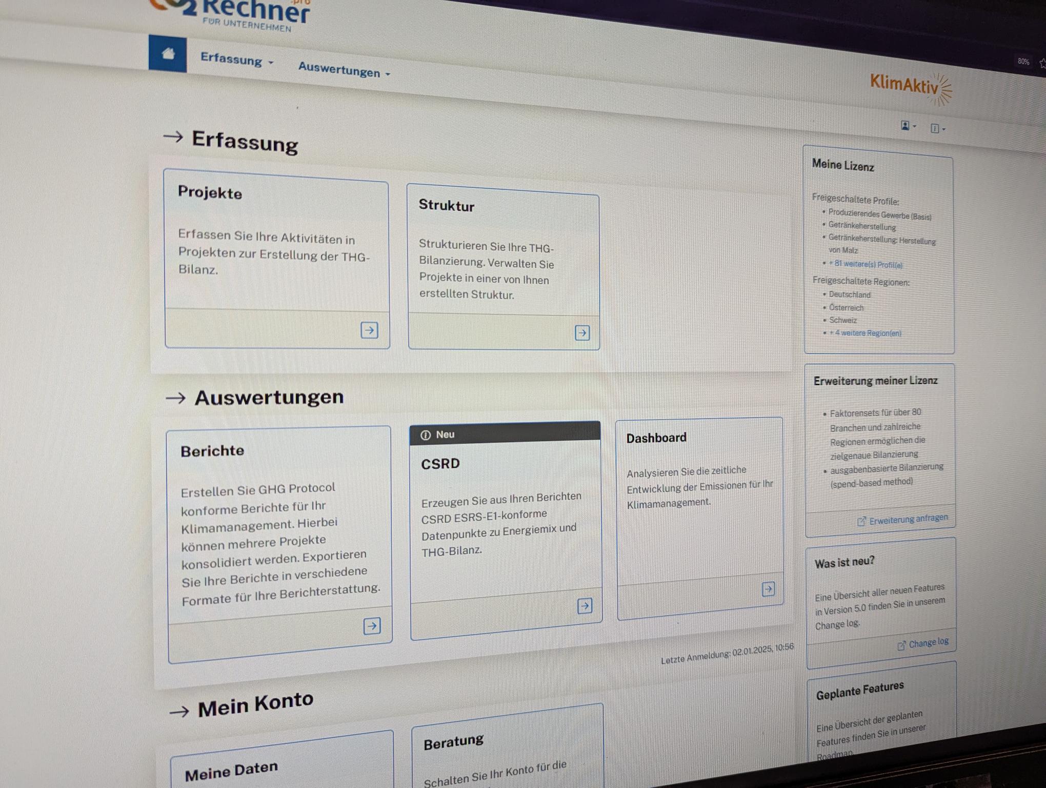 Der CO2-Rechner.PRO ist dank seiner benutzungsfreundlichen grafischen Oberfläche intuitiv bedienbar, auch ohne Vorwissen. Das System fördert durch seinen logisch strukturierten Aufbau eine effiziente Datenerfassung. Durch die Bereitstellung als Software as a Service (SaaS) vermeiden Sie Installationsprozesse und haben stets Zugriff auf eine aktualisierte Version des Systems.