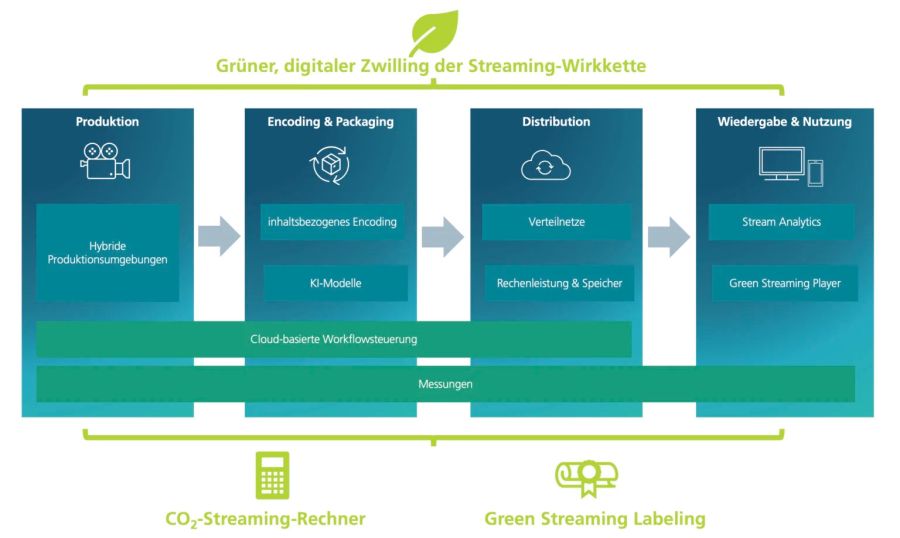 Bisher ist der CO2-Fußabdruck von Streaming noch mit großen Unsicherheiten behaftet. Mit dem vom Bundesministerium für Forschung, Technologie und Raumfahrt (BMFTR), vormals von Bundesministerium für Wirtschaft und Klimaschutz (BMWK) geförderten Green Streaming Projekt soll sich das bald ändern. Das Projekt befasst sich mit der Energieeffizienz und Nachhaltigkeit entlang der gesamten Streaming-Wirkkette und zielt darauf ab, alle Komponenten entlang der Wirkkette zu analysieren und zu optimieren. Dadurch soll ein nachhaltiger Betrieb und eine umweltfreundliche Nutzung von Streaming-Inhalten ermöglicht werden.