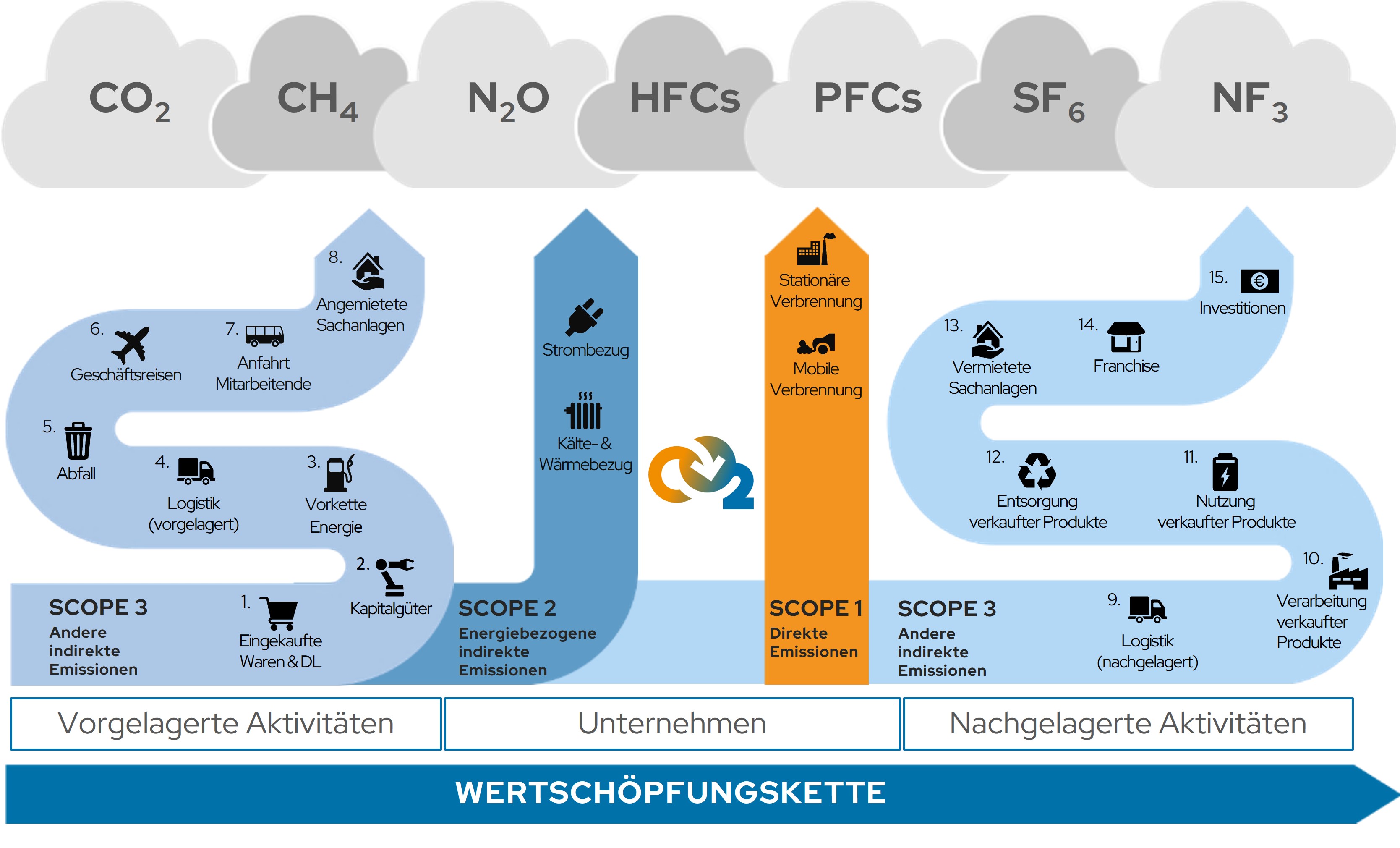 Betrachtet werden sowohl direkte Treibhausgas (THG)-Emissionen, z.B. aus Fuhrpark oder Produktion, als auch indirekte Emissionen aus eingekaufter Elektrizität, Wärme, Kälte oder Dampf sowie aus weiteren Quellen wie beispielsweise Dienstreisen, Logistik oder eingekaufte Waren und Dienstleistungen. Die Bilanzierungsgrundsätze liefert das Greenhouse Gas Protocol (GHG Protocol).
