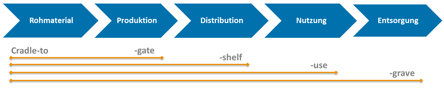 Betrachtet werden kann der gesamte Lebenszyklus eines Produktes, von der Extraktion der Rohstoffe aus dem Boden über die Verarbeitung, den Vertrieb und die Nutzung durch den Verbraucher bis zur Entsorgung (Von der Wiege zur Bahre bzw. Cradle to Grave). Je nach Zielsetzung und Position des Auftraggebers in der Wertschöpfungskette sind auch andere Systemgrenzen in der Praxis sinnvoll und gängig.